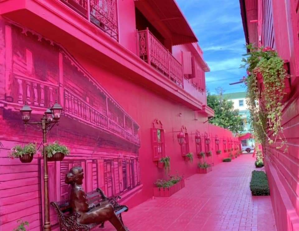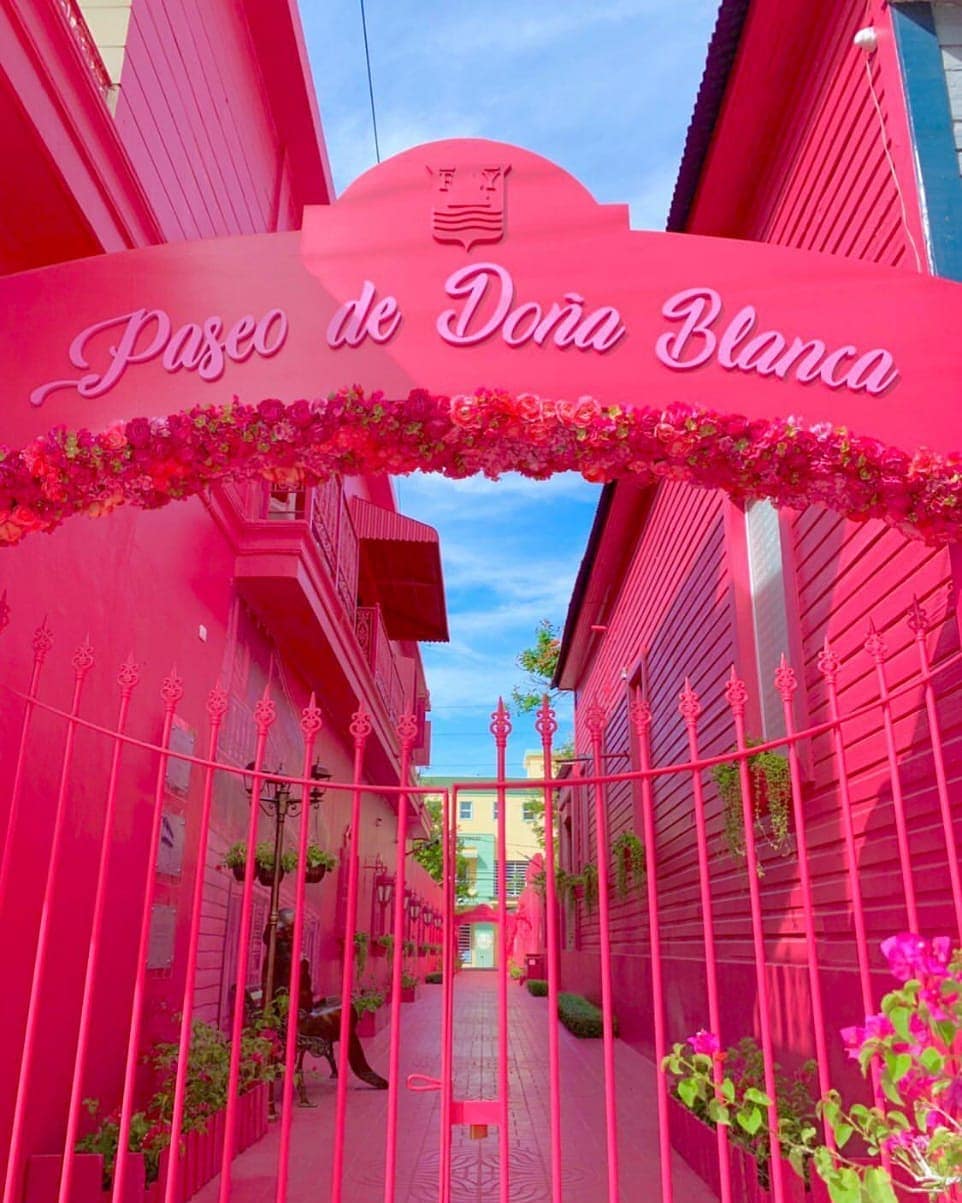 Paseo de Doña Blanca: Pink street, with green plants, windows, street lams, decorative caribbean entourage in old city victorian style, Puerto plata, Dominican Republic, Paseo de doña Blanca.